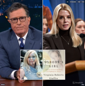 The late-night host praised Giuffre’s courage — then turned his outrage toward Pam Bondi, accusing her of “keeping truth buried to protect the powerful” and pointedly suggesting she read the book herself. What Colbert vowed to do next sent shockwaves through the country