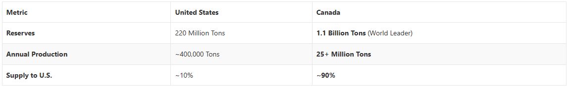While the U.S. has minor mines in Michigan, Utah, and New Mexico, they produce lower-quality ore at volumes that cannot meet even a fraction of national demand. Canada’s production is 36 times larger than America’s. With Russia and Belarus—the only other major exporters—largely cut off from Western markets since 2022, Canada doesn’t just dominate the market; it owns it.